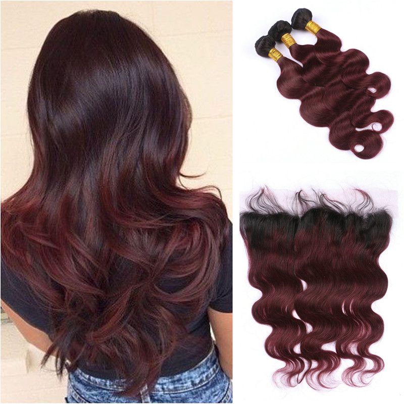 Top Quality Dark Root Wine Red Human Hair Bundles With Lace Frontal 1b 99j Body Wave Hair Weaves With Ear To Ear Frontal