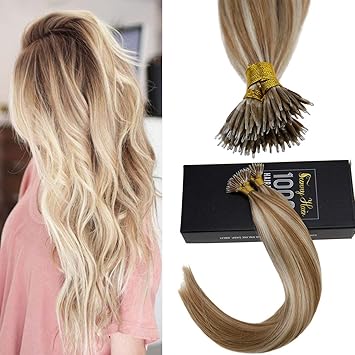 Sunny 18inch Nano Ring Hair Extensions With Nano Ring Beads Color Caramel Blonde Highlight Bleach