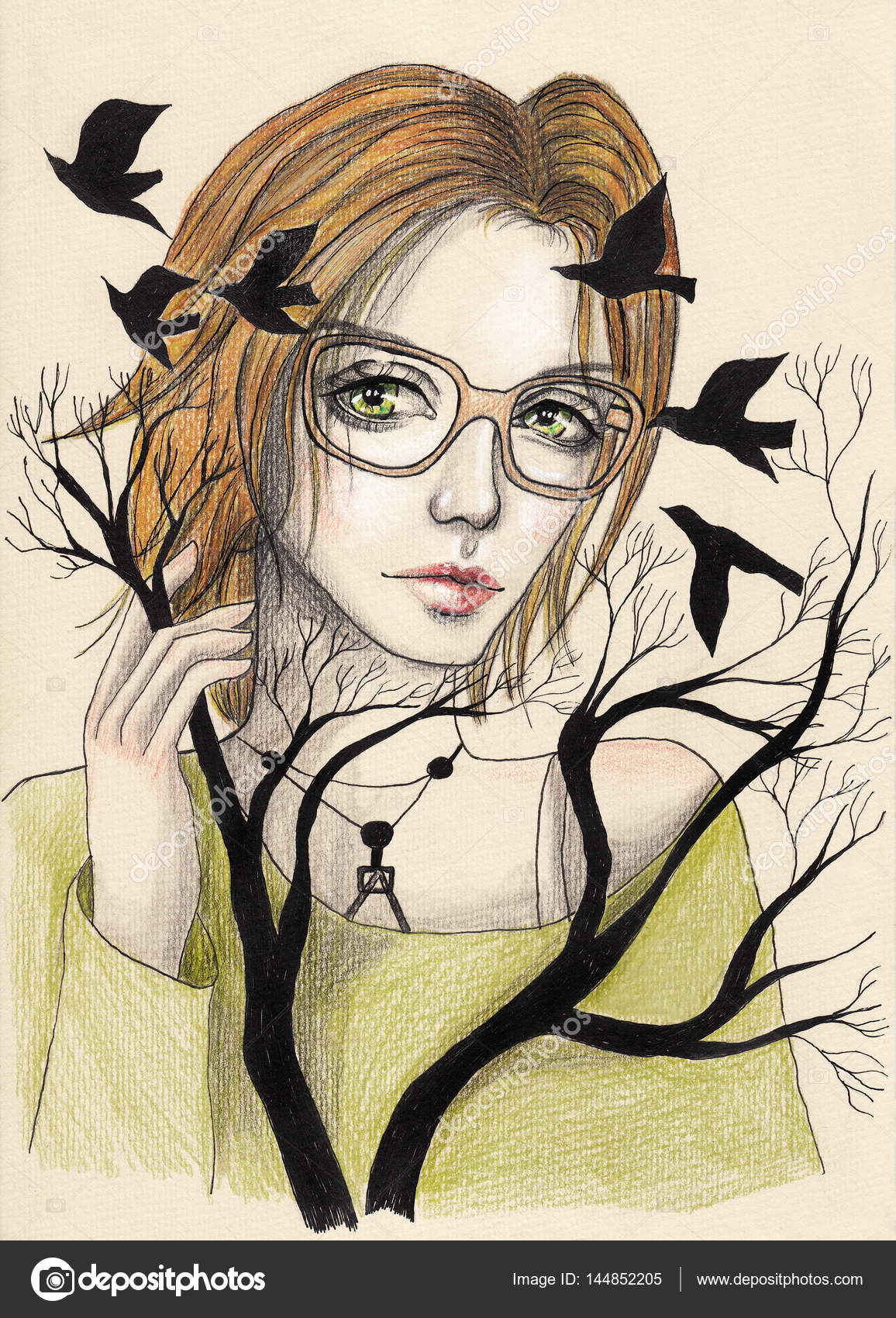 Beautiful Girl With Blonde Hair And Glasses Trees And